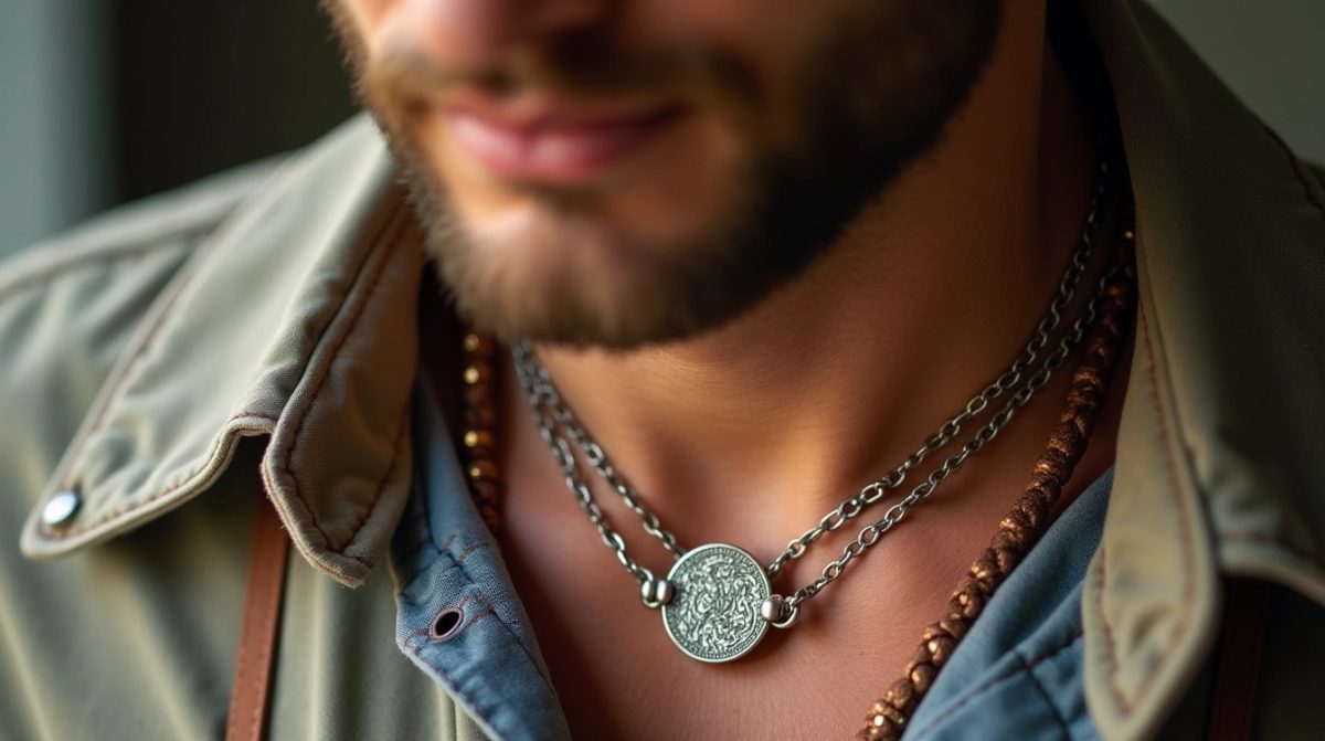 Le layering, ou superposition de colliers, est une pratique de plus en plus adoptée par les hommes. L’idée ? Associer plusieurs chaînes de longueurs différentes pour créer du relief et du mouvement. Par exemple, une chaîne fine à 45 cm, une plaque militaire à 50 cm, et une croix plus longue à 60 cm. L’astuce ? Varier les textures – fine, tressée, massée – tout en gardant une harmonie des couleurs (tous en métal blanc, par exemple). Attention au désordre : 2 à 3 pièces maximum pour rester élégant.